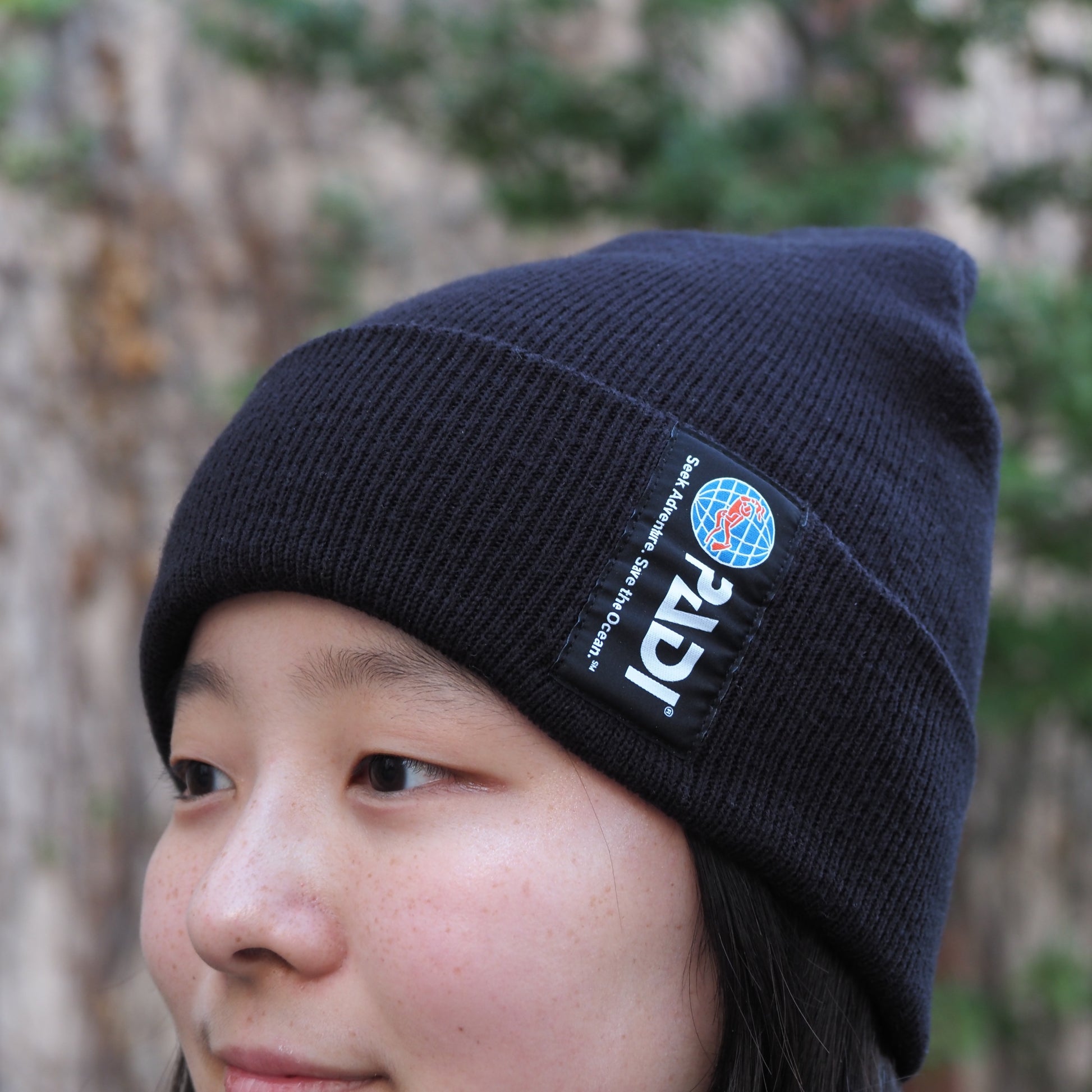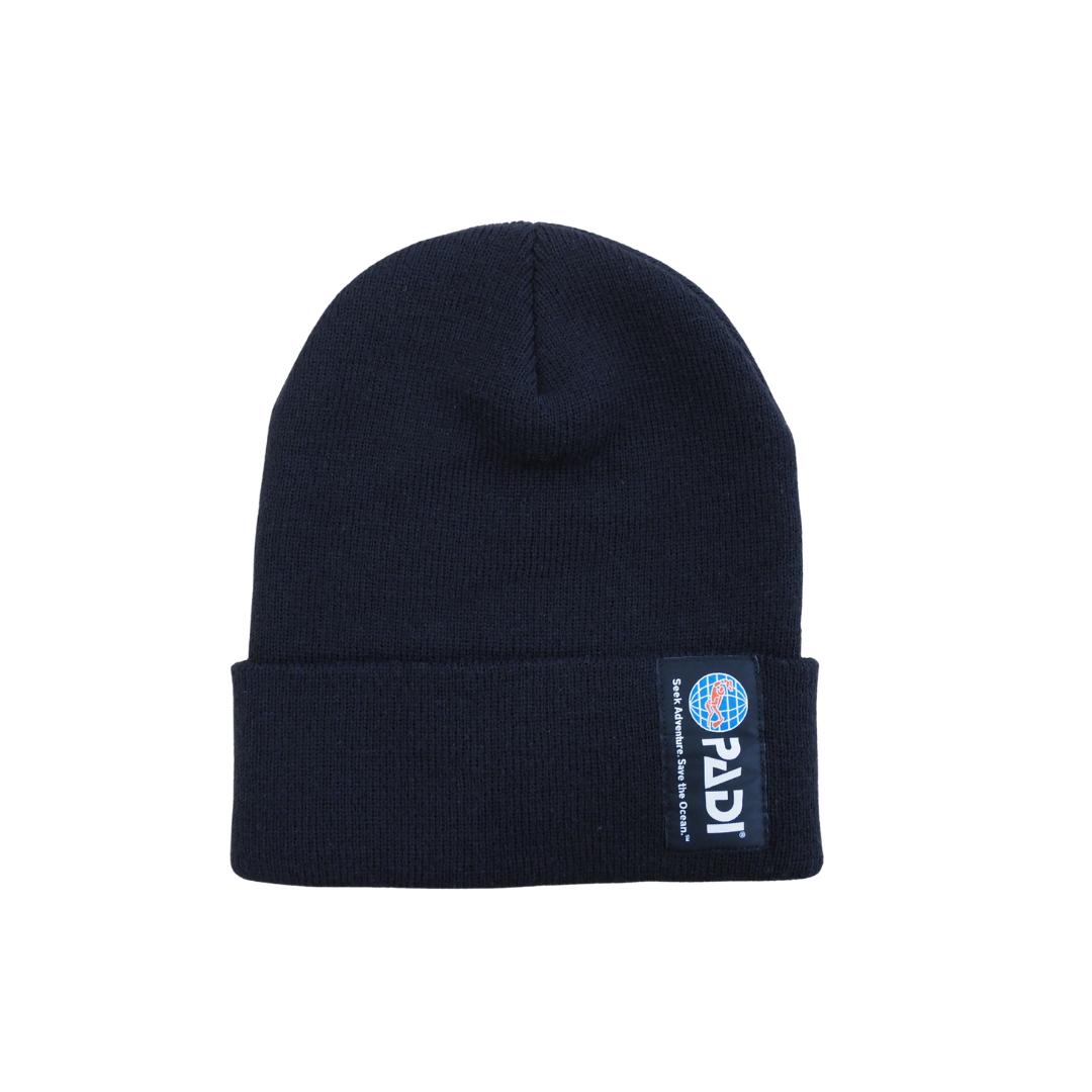 冬の定番スタイルにぴったりなクラシックデザインのニットキャップ。左側には PADIロゴ とタグライン 「Seek Adventure, Save the Ocean」 の刺繍を施し、シンプルながら存在感のある仕上がりに。素材は100%リサイクルアクリル を使用し、あたたかさと環境配慮のどちらも叶えました。寒い季節のダイビング前後はもちろん、普段の街でのコーデにもおすすめのアイテムです。